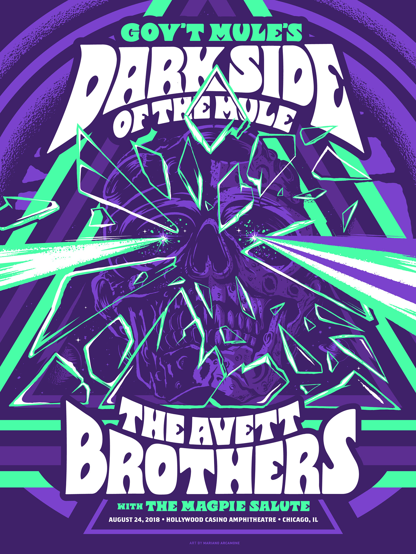 Poster for Gov't Mule’s DARK SIDE OF THE MULE & The Avett Brothers show at Hollywood Casino Amphitheatre Chicago, August 24, 2018.